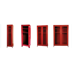 Fabricados en resina poliester reforzados con fibra de vidrio. Resistentes a la corrosión, intemperie y ambiente marino. Cuentan con puertas abatibles con cerradura y (2) llaves, dos entrepaños y ganchos (percheros) para sujeción de los chaquetones y/o cascos, herrajes en material de acero inoxidable. Libres de mantenimiento, vida de servicio ilimitada. Disponible en medidas para guardar 1, 2, 4 y 6 equipos de bombero. Para uso en interiores y exteriores, en inmuebles que cuentan con brigadas contra incendio en industrias, comercios, almacenes, estaciones de bombero, entre otros. Estos gabinetes o cajas se pueden utilizar para mangueras contra incendio, extintores, equipo contra incendio en general, chalecos salvavidas y se pueden fabricar en las formas y medidas que se soliciten.